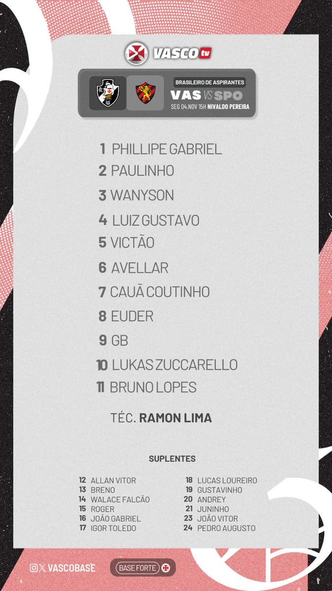 Time do Vasco definido para o desafio contra o Sport no Campeonato Brasileiro de Aspirantes. Não perca, acompanhe na VascoTV!