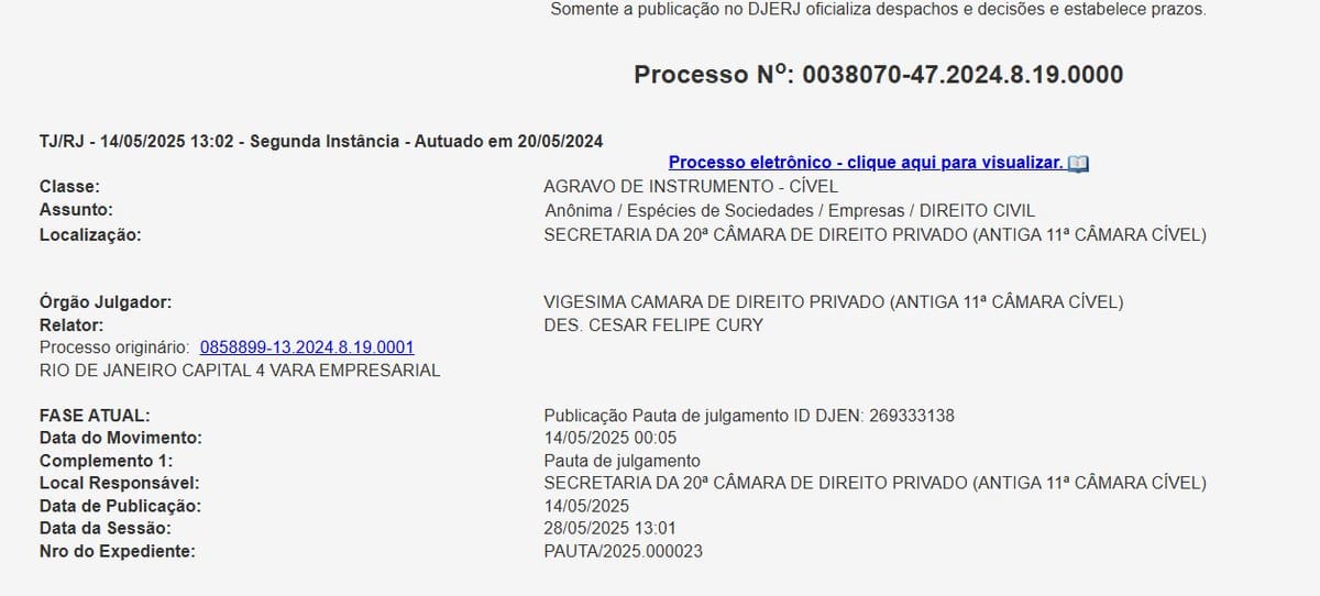 TJRJ agenda julgamento do recurso da 777 contra a liminar que concedeu poderes de gestão da SAF ao CRVG para 07/05 segunda-feira, 14/04/2025 às 23:24 — Em Últimas notícias