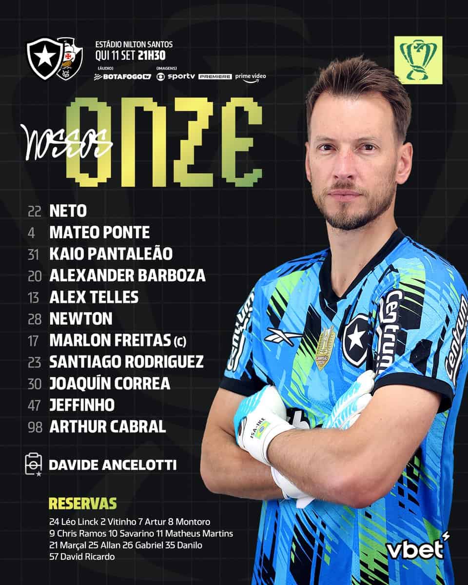 Veja a escalação do Botafogo para o jogo contra o Vasco: o ex-jogador do Vasco Allan é uma das alternativas no banco. quarta-feira, 05/11/2025 às 18:45 — Em Últimas notícias