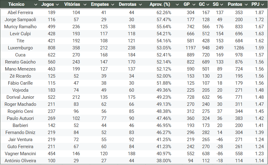 Aproveitamento dos técnicos com mais de 100 jogos pelo Campeonato Brasileiro: uma comparação detalhada quarta-feira, 24/12/2025 às 11:33 — Em Últimas notícias