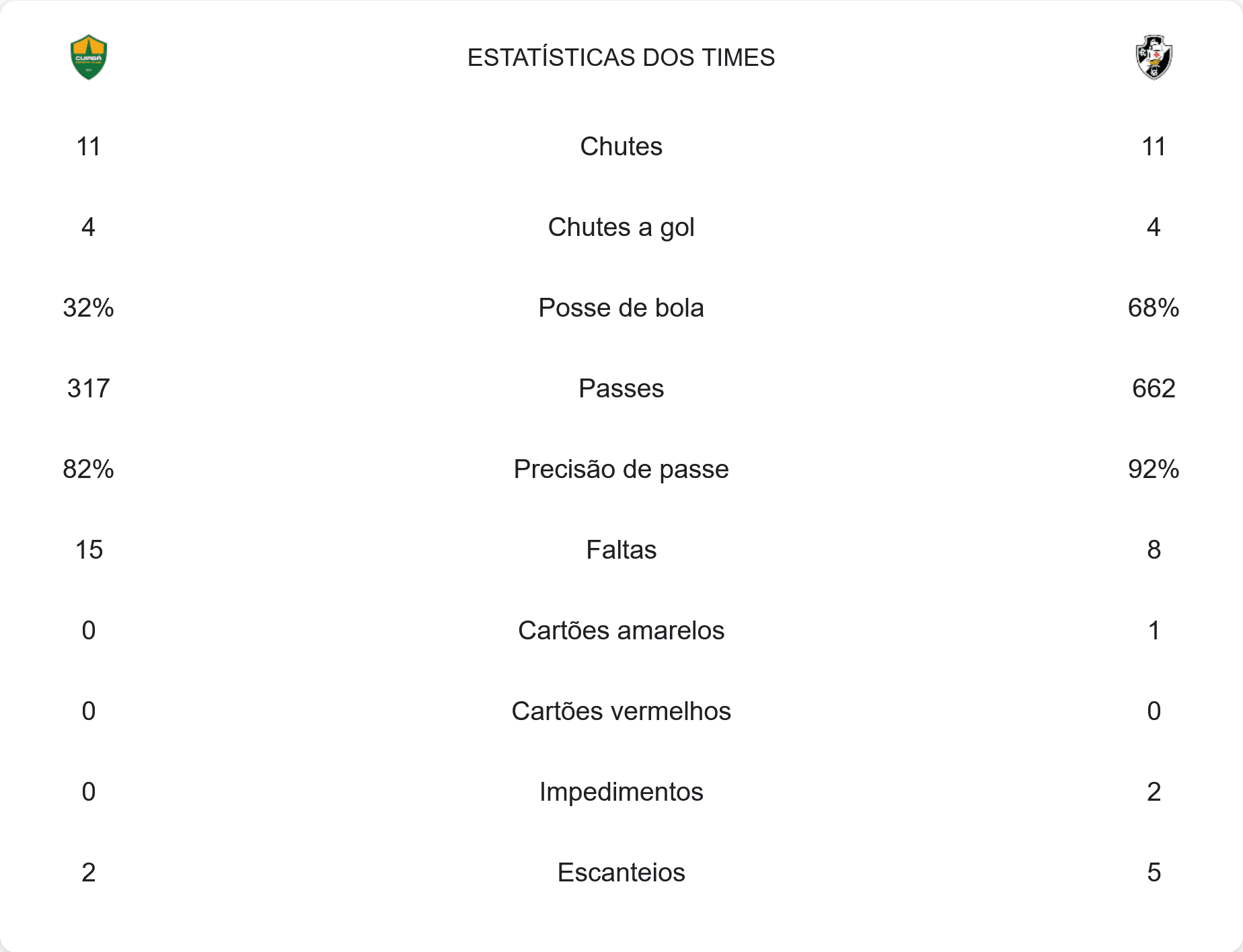 Intervalo na Arena Pantanal; Vasco está na frente, vencendo o Cuiabá por 2 a 1. domingo, 08/12/2024 às 16:55 — Em Últimas notícias