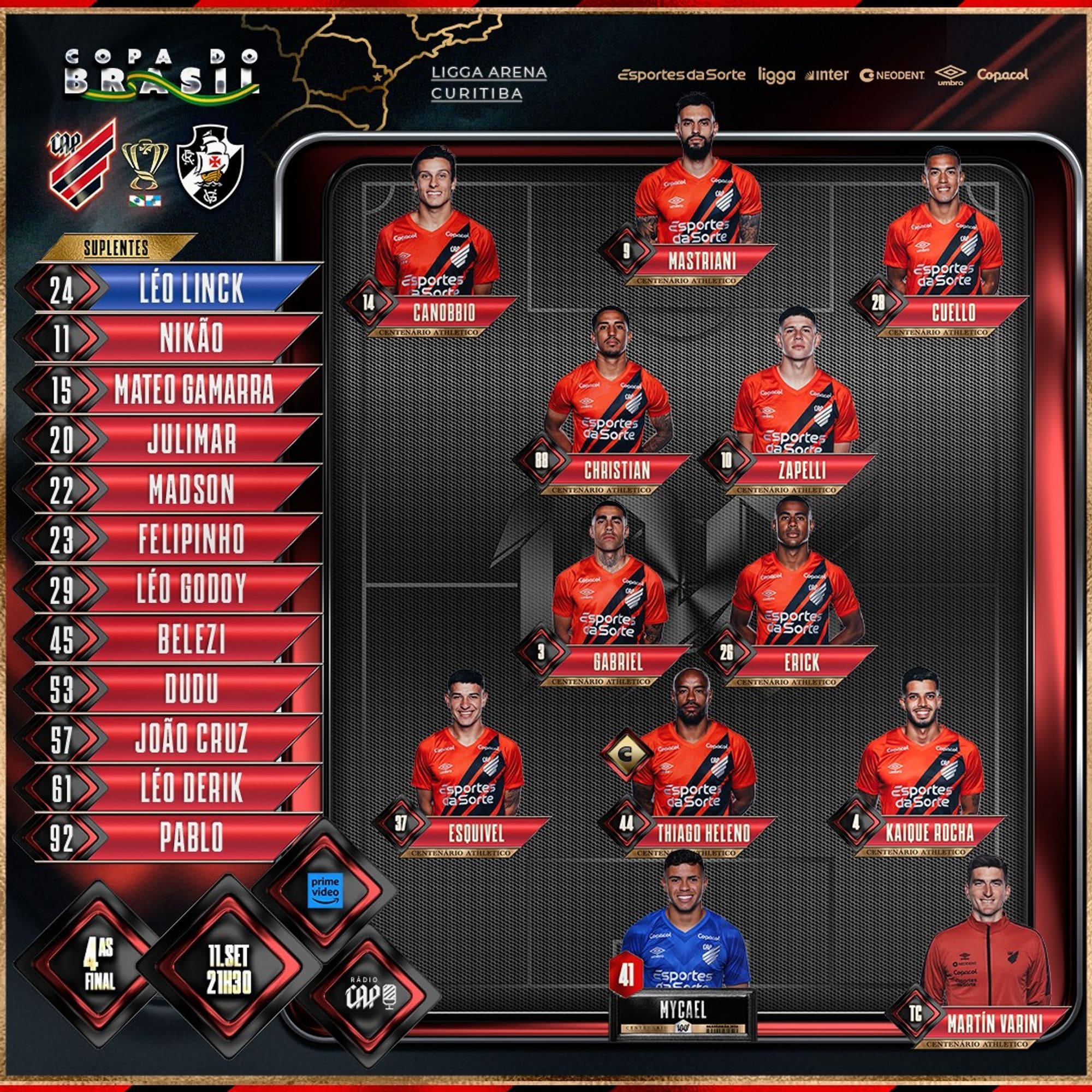 Confira a formação do Athletico-PR para o confronto com o Vasco; o ex-jogador do Vasco, Madson, figura entre as alternativas no banco. quarta-feira, 11/09/2024 às 20:41 — Em Últimas notícias