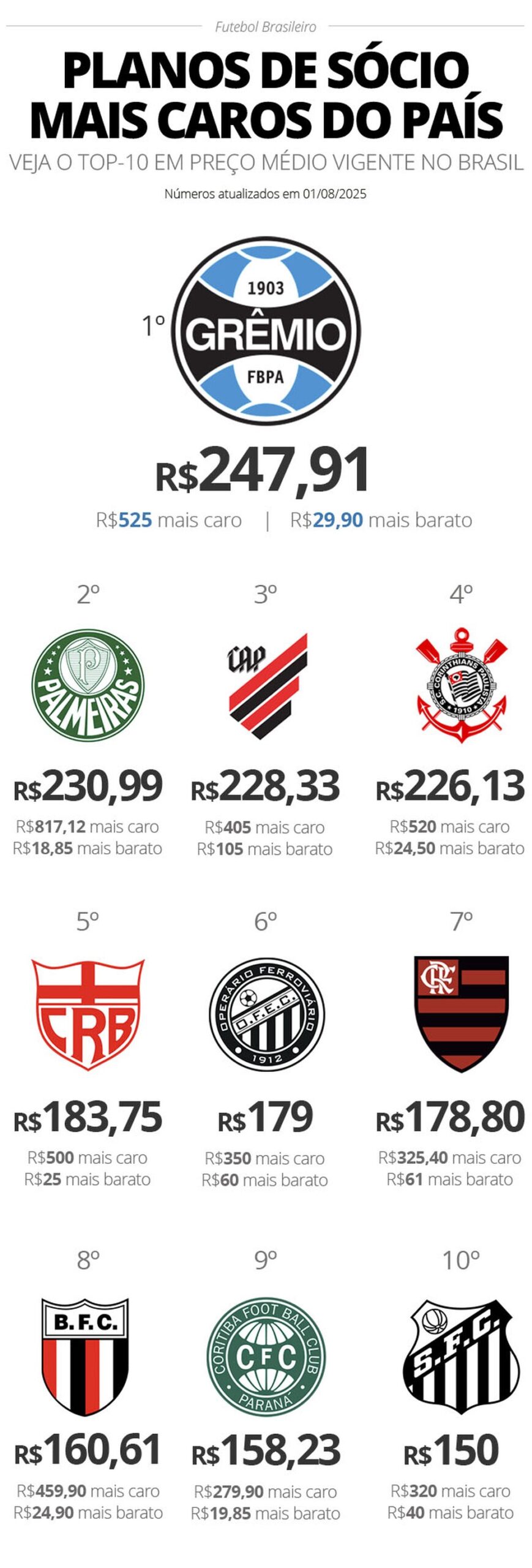 Vasco ocupa a 23ª posição no ranking dos valores médios dos planos de sócio do Brasil. domingo, 03/08/2025 às 06:32 — Em Últimas notícias