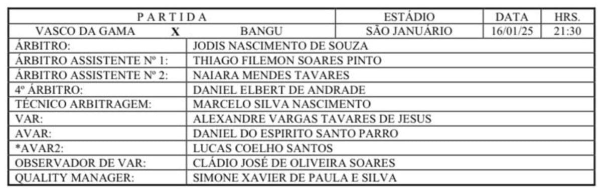 Jodis Nascimento de Souza será o árbitro da partida entre Vasco e Bangu; Alexandre Vargas Tavares de Jesus ficará responsável pelo VAR. segunda-feira, 13/01/2025 às 14:33 — Em Últimas notícias