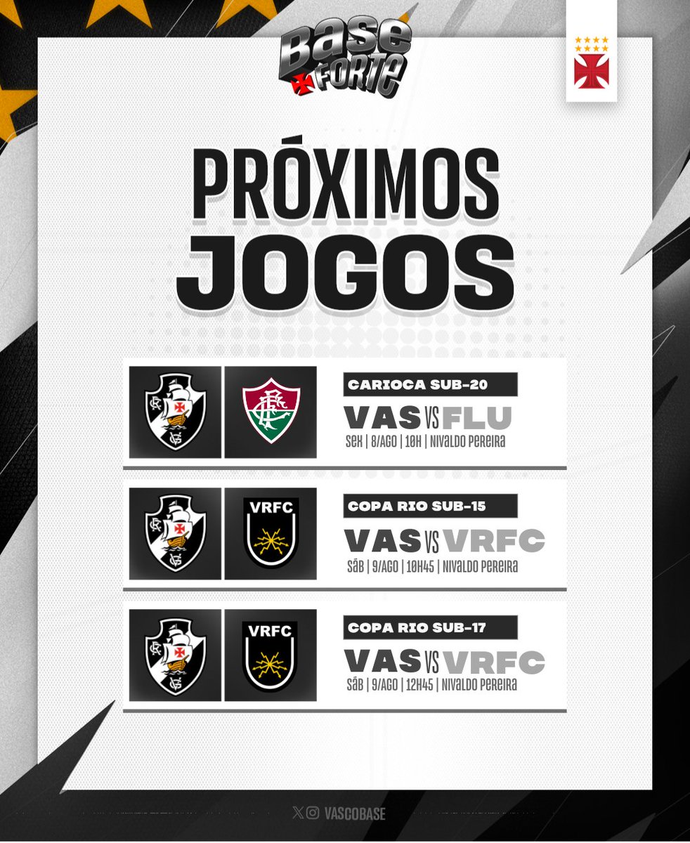 Vasco se confronta com o Volta Redonda neste sábado no Nivaldo Pereira a partir das 10h45 pela Copa Rio das categorias Sub-15 e Sub-17 com transmissão da VascoTV. sábado, 09/08/2025 às 08:20 — Em Base