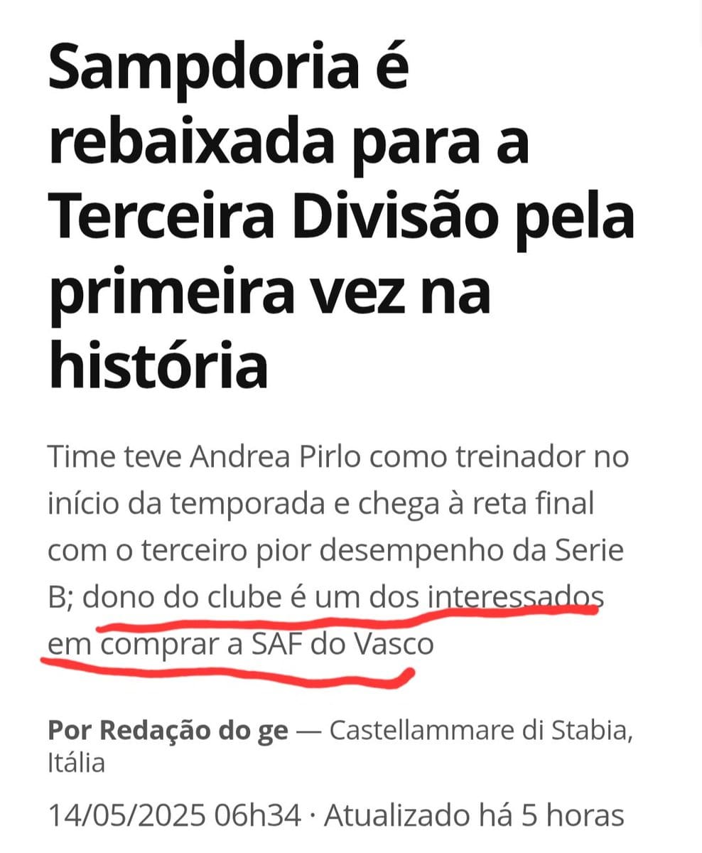 Sampdoria, time de Andrea Radrizzani, um dos interessados na SAF do Vasco, sofre rebaixamento inédito para a 3ª divisão italiana. quinta-feira, 15/05/2025 às 03:38 — Em Últimas notícias