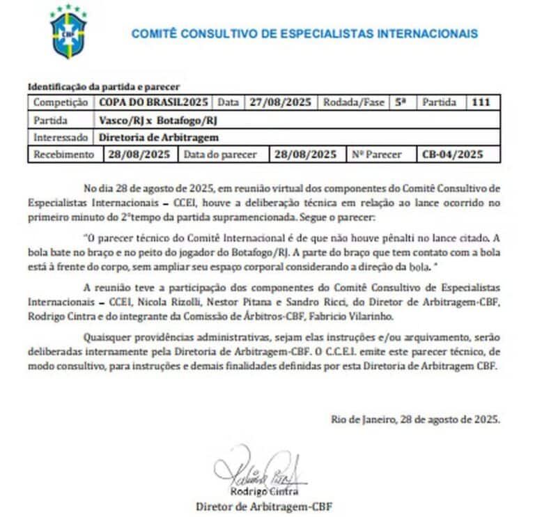 CBF se manifesta sobre não marcação de pênalti em Vasco 1 x 1 Botafogo sábado, 30/08/2025 às 20:27 — Em Últimas notícias