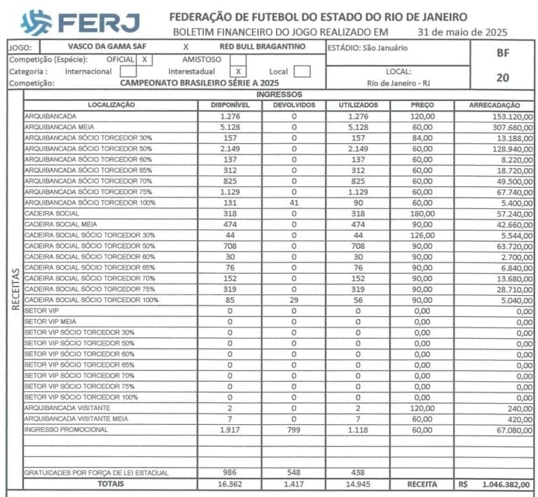 Vasco lucra R$ 381 mil na partida contra o Red Bull Bragantino! Veja todos os detalhes do relatório financeiro.