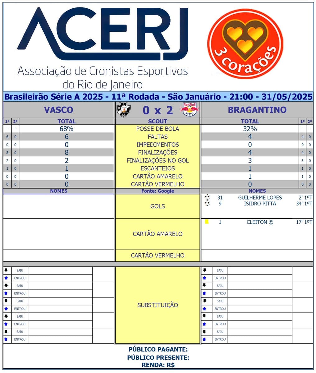 VASCO É DERROTADO PELO RED BULL BRAGANTINO EM SÃO JANUÁRIO: 2 A 0 sábado, 31/05/2025 às 22:58 — Em Destaques