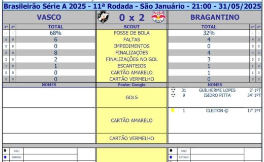 VASCO É DERROTADO PELO RED BULL BRAGANTINO EM SÃO JANUÁRIO: 2 A 0 sábado, 31/05/2025 às 22:58 — Em Destaques