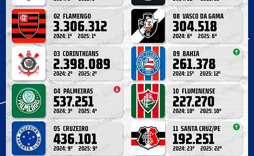 Vasco é o 8º clube brasileiro que mais ganhou seguidores no Instagram em 2025 terça-feira, 06/01/2026 às 11:36 — Em Últimas notícias