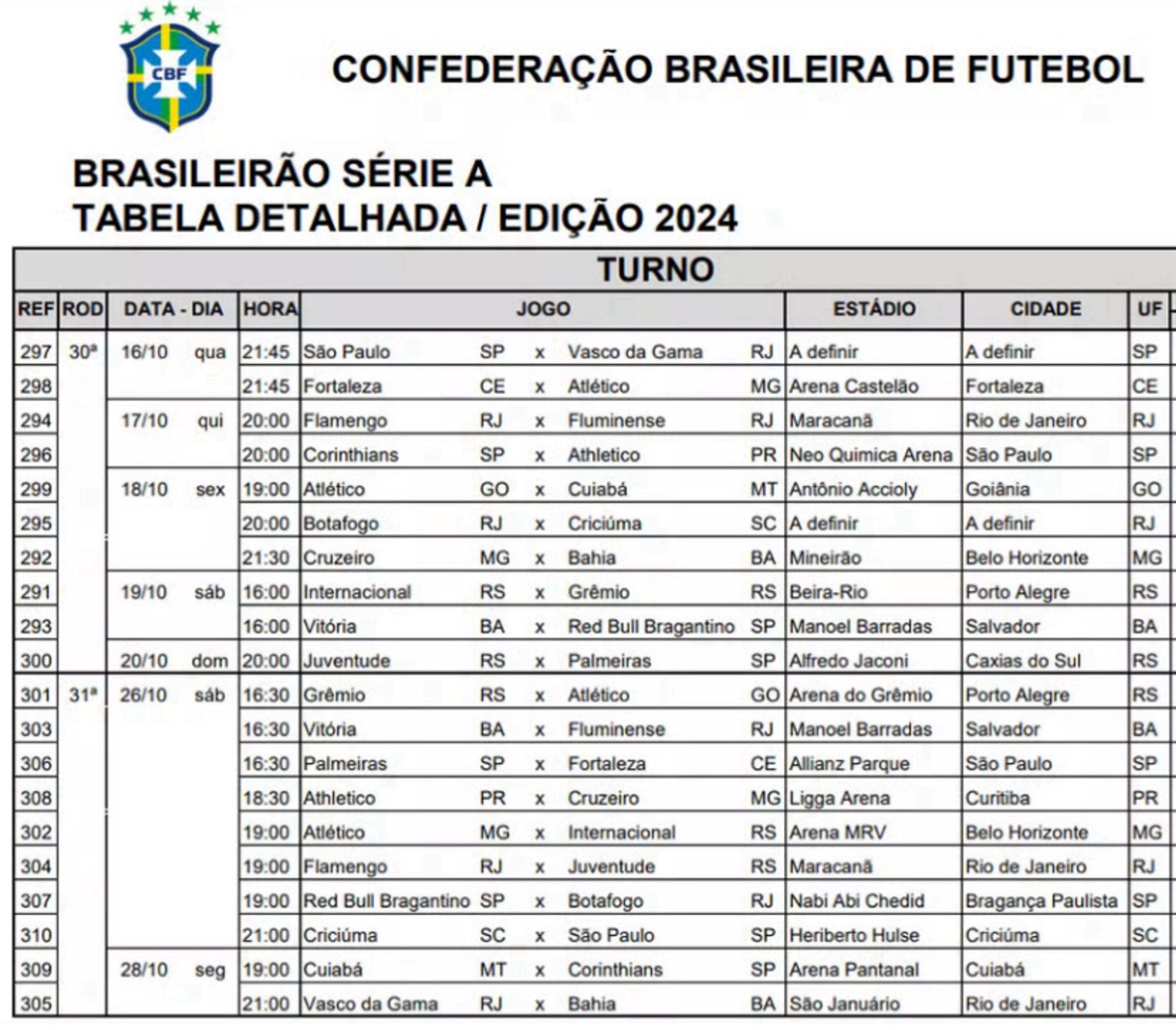 Vasco x Bahia, referente à 31ª rodada do Campeonato Brasileiro, ocorrerá no dia 28 de outubro, às 21h. quarta-feira, 02/10/2024 às 08:49 — Em Últimas notícias