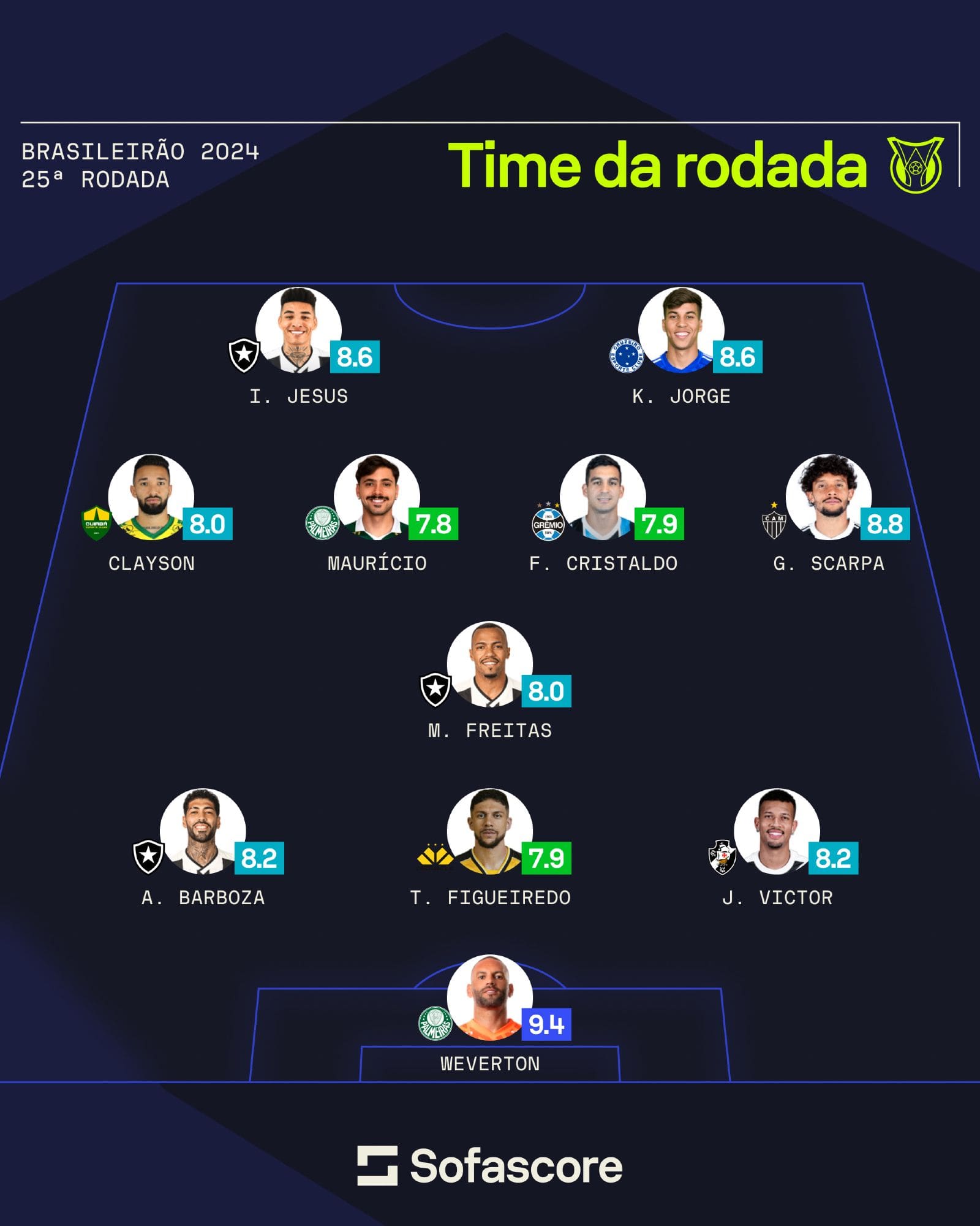 João Victor brilha e é destaque na escalação ideal do Sofascore da 25ª rodada do Campeonato Brasileiro segunda-feira, 02/09/2024 às 16:53 — Em Últimas notícias