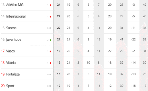 Vasco na 17ª colocação do Brasileiro após jogos da 21ª rodada sábado, 30/08/2025 às 23:15 — Em Últimas notícias
