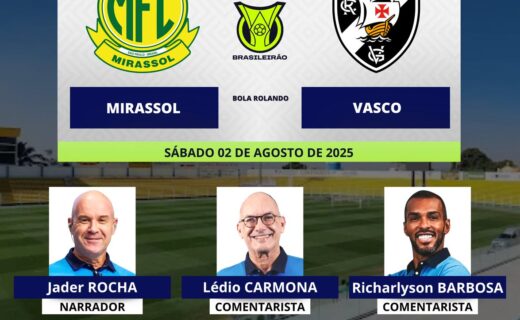 Conheça os especialistas que estarão na transmissão de Mirassol x Vasco pela televisão. sábado, 02/08/2025 às 09:44 — Em Últimas notícias