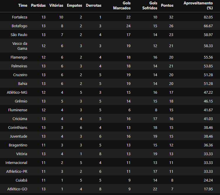 Vasco Estatísticas @Vasco_Estatisticas Ao analisarmos a performance do Vasco da 11ª rodada até o momento (Era Paiva), podemos ver que o time possui o 4° melhor rendimento no Campeonato Brasileiro 2024. Apenas São Paulo, Botafogo e Fortaleza conquistaram mais pontos no mesmo período. Fonte: X Vasco Estatísticas