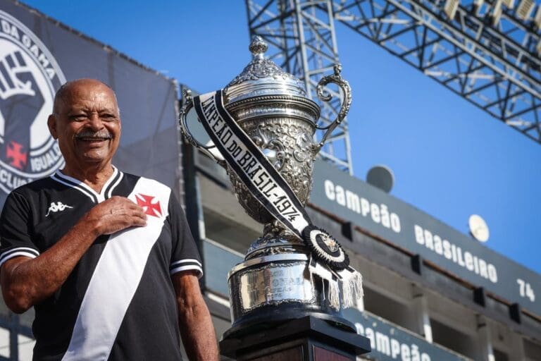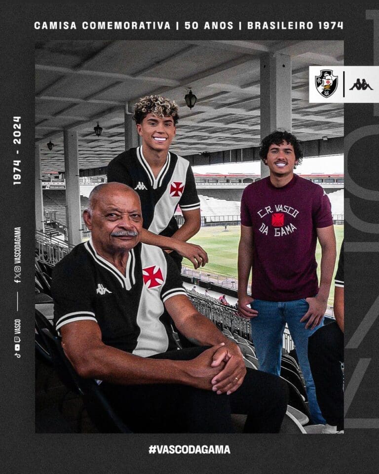 O Vasco celebra um momento especial ao compartilhar uma imagem do ex-lateral Alfinete, que encanta os torcedores ao vestir a nova camisa comemorativa em homenagem aos 50 anos da vitória no Campeonato Brasileiro de 1974. Uma tradição que se
