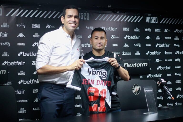 O jogador Jean David exibe orgulhoso a nova camisa 21 do Vasco da Gama, posando para fotos e demonstrando todo seu entusiasmo em vestir as cores do clube.