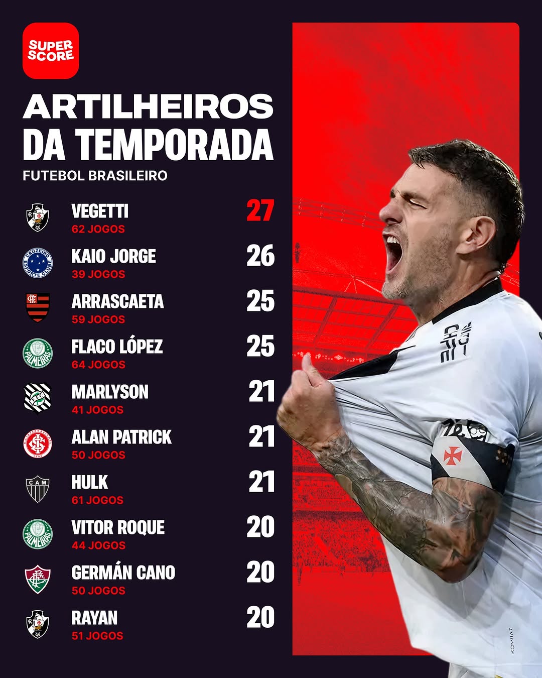 Com 27 gols, Vegetti é o artilheiro do futebol brasileiro em 2025 quarta-feira, 17/12/2025 às 07:44 — Em Últimas notícias