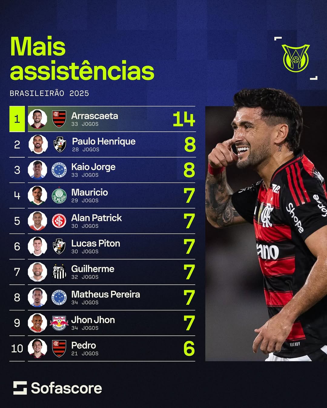 Empatado com o cruzeirense Kaio Jorge, Paulo Henrique alcançou a segunda posição no ranking de assistências do Campeonato Brasileiro 2025. segunda-feira, 08/12/2025 às 23:12 — Em Últimas notícias