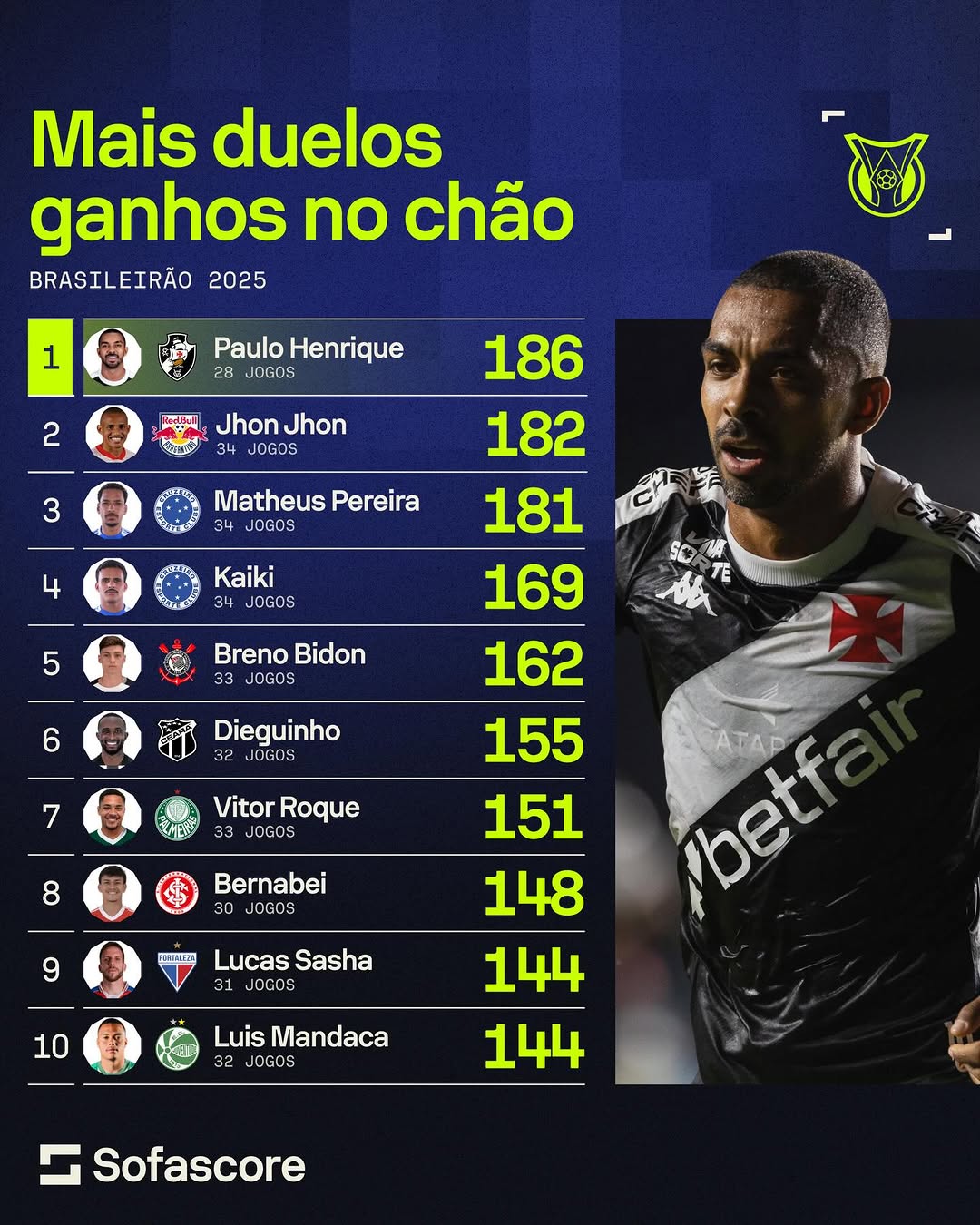 Paulo Henrique se destacou como o líder em duelos ganhos no chão, ficou em 2º lugar em dribles certeiros, 3º em desarmes e 4º em recuperações de bola no Campeonato Brasileiro 2025. terça-feira, 09/12/2025 às 04:09 — Em Últimas notícias
