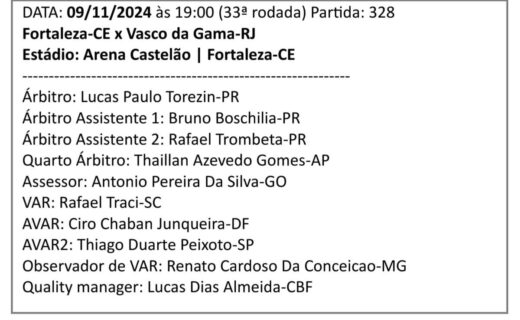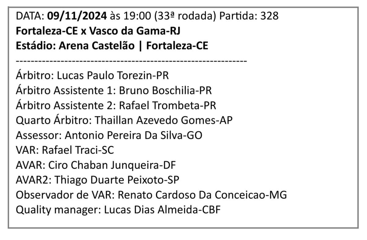 Lucas Paulo Torezin, árbitro do PR, será o responsável pela partida entre Fortaleza e Vasco. quarta-feira, 06/11/2024 às 20:47 — Em Últimas notícias