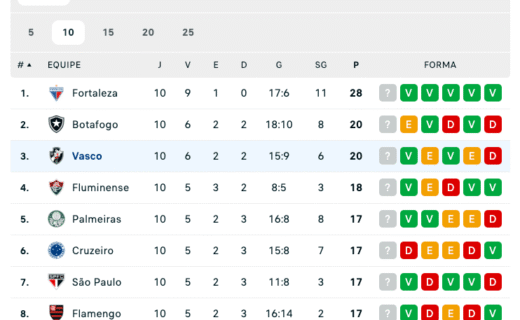 Vasco só fica atrás do Fortaleza nos últimos 10 jogos do Brasileirão! quarta-feira, 28/08/2024 às 10:49 — Em Últimas notícias