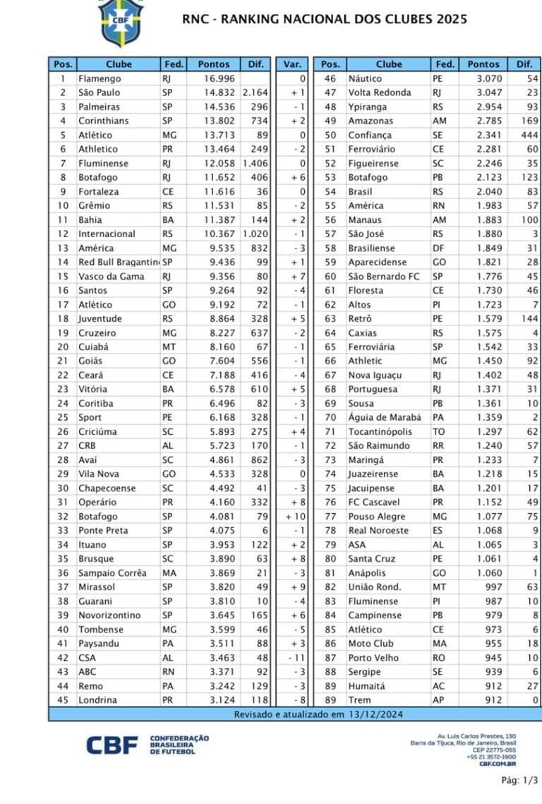 CBF revela atualização de seu ranking de clubes; Vasco ocupa a 15ª posição sexta-feira, 13/12/2024 às 18:59 — Em Últimas notícias