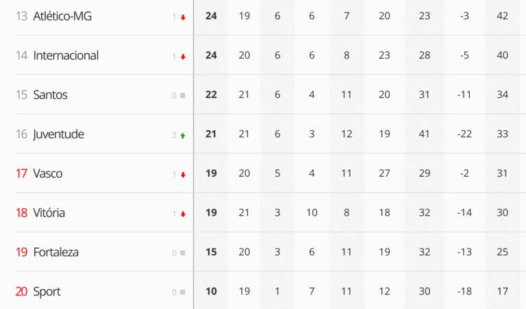 Vasco ocupa a 17ª posição no Campeonato Brasileiro após os jogos de sábado da 20ª rodada e poderá sair do Z4 se conseguir uma vitória contra o Santos. sábado, 16/08/2025 às 23:17 — Em Últimas notícias
