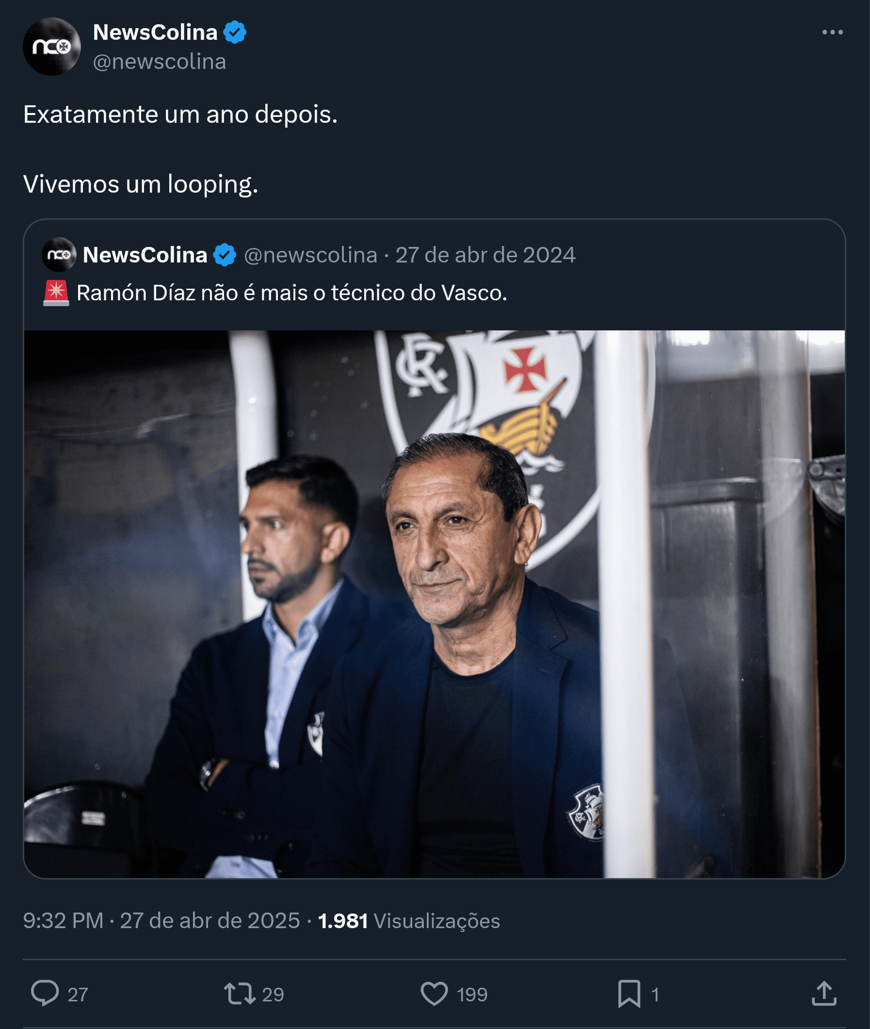 Emiliano Díaz afirma que Ramón Díaz foi mal entendido ao dizer que o Corinthians é superior ao Vasco. quarta-feira, 07/05/2025 às 01:25 — Em Últimas notícias
