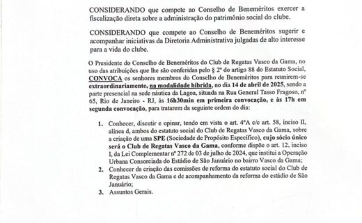 Conselho de Beneméritos irá se reunir em 14/04 para debater a reforma do estatuto e a modernização de São Januário. quarta-feira, 09/04/2025 às 14:24 — Em Últimas notícias