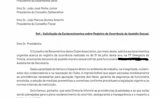 Presidente do Conselho de Beneméritos solicita esclarecimentos sobre alegações de assédio moral e sexual no clube quinta-feira, 14/08/2025 às 04:39 — Em Últimas notícias