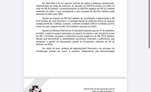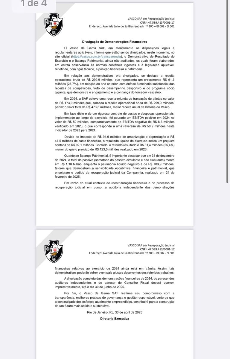 Relatório divulgado pelo Vasco não foi verificado e carece do parecer do Conselho Fiscal. quarta-feira, 30/04/2025 às 23:10 — Em Últimas notícias
