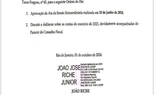 Conselho Deliberativo se reunirá nesta terça-feira para deliberar sobre as contas de 2023, que marcam o ano final da gestão Salgado. quarta-feira, 09/10/2024 às 01:55 — Em Últimas notícias