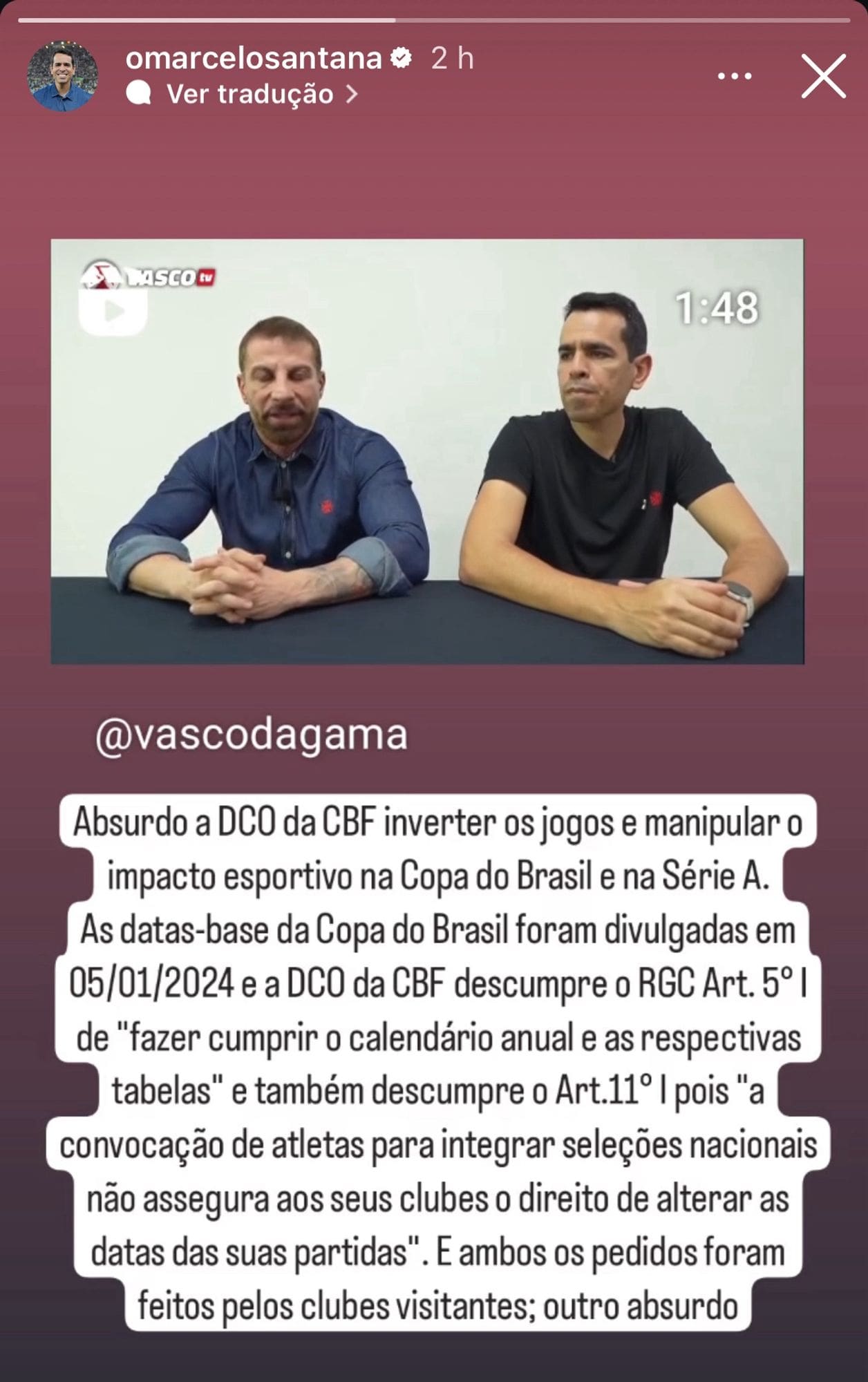 Em nota, o Vasco anuncia que protocolou uma ação no STJD contestando a alteração da data do segundo jogo da semifinal da Copa do Brasil. segunda-feira, 30/09/2024 às 22:25 — Em Últimas notícias