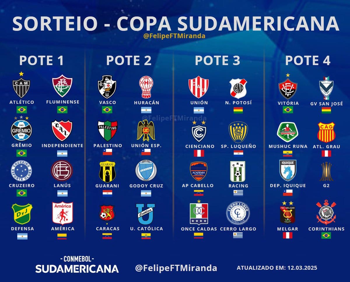 Confira os potes para o sorteio da Copa Sul-Americana 2025 sexta-feira, 14/03/2025 às 00:32 — Em Últimas notícias
