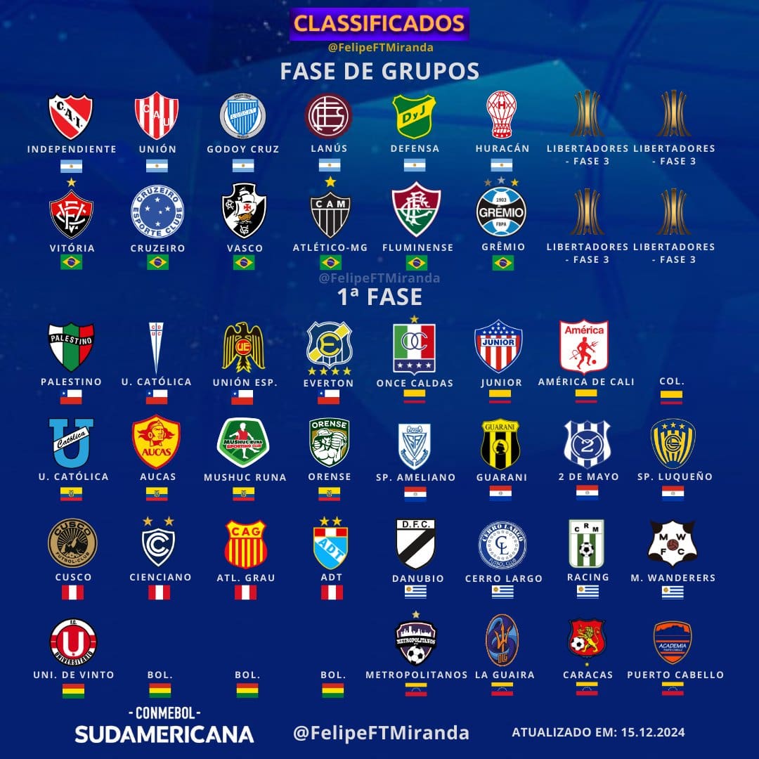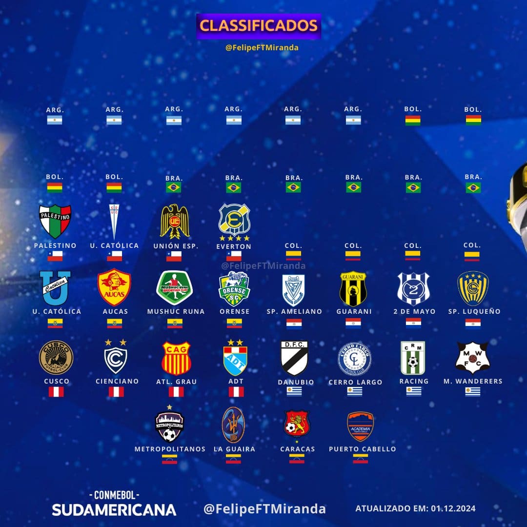 Confira as equipes que já garantiram classificação para a Copa Sul-Americana 2025 até agora. domingo, 15/12/2024 às 23:23 — Em Últimas notícias