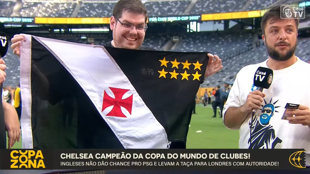 Casimiro Miguel, proprietário da CazéTV, ostenta a bandeira do Vasco no estádio que acolheu a final da Copa do Mundo de Clubes. domingo, 13/07/2025 às 23:55 — Em Últimas notícias