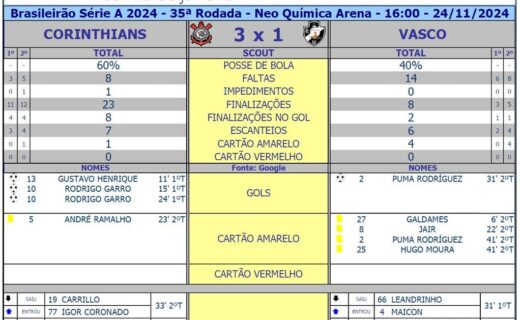 Confira as estatísticas do jogo Corinthians 3 x 1 Vasco domingo, 24/11/2024 às 18:00 — Em Últimas notícias
