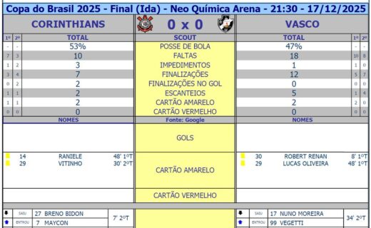 Corinthians x Vasco: Estatísticas do 1º Tempo da Partida quarta-feira, 17/12/2025 às 22:33 — Em Últimas notícias