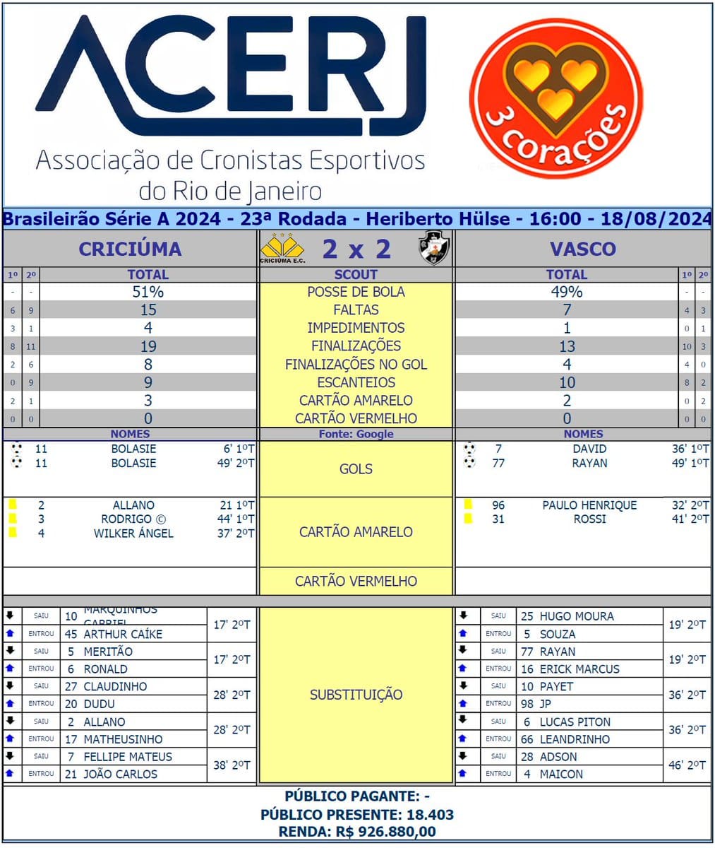 Criciúma x Vasco atraiu 18.403 espectadores ao estádio Heriberto Hülse. domingo, 18/08/2024 às 18:07 — Em Últimas notícias