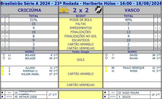 Confira os números de Criciúma 2 x 2 Vasco: Estatísticas do jogo. domingo, 18/08/2024 às 18:11 — Em Últimas notícias