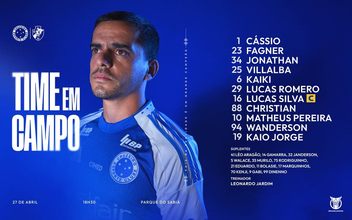 Confira a escalação do Cruzeiro para a partida contra o Vasco; ex-vascaíno Fagner é escalado como titular. domingo, 27/04/2025 às 17:37 — Em Últimas notícias