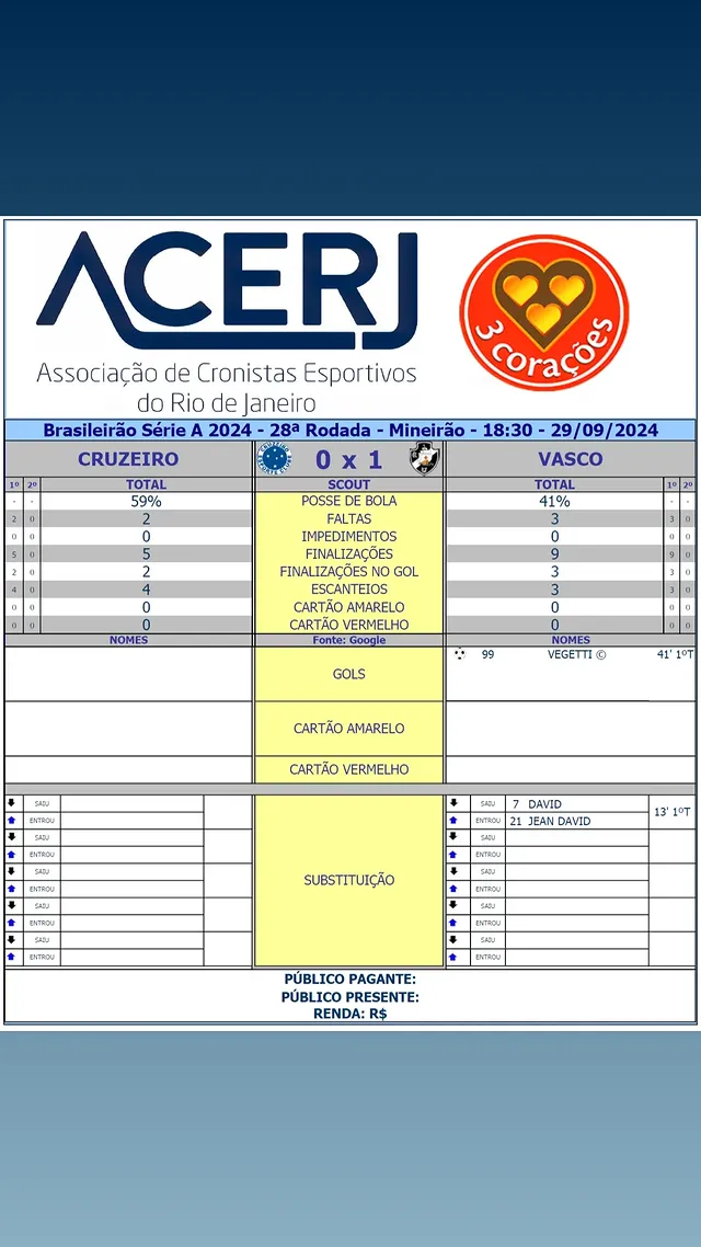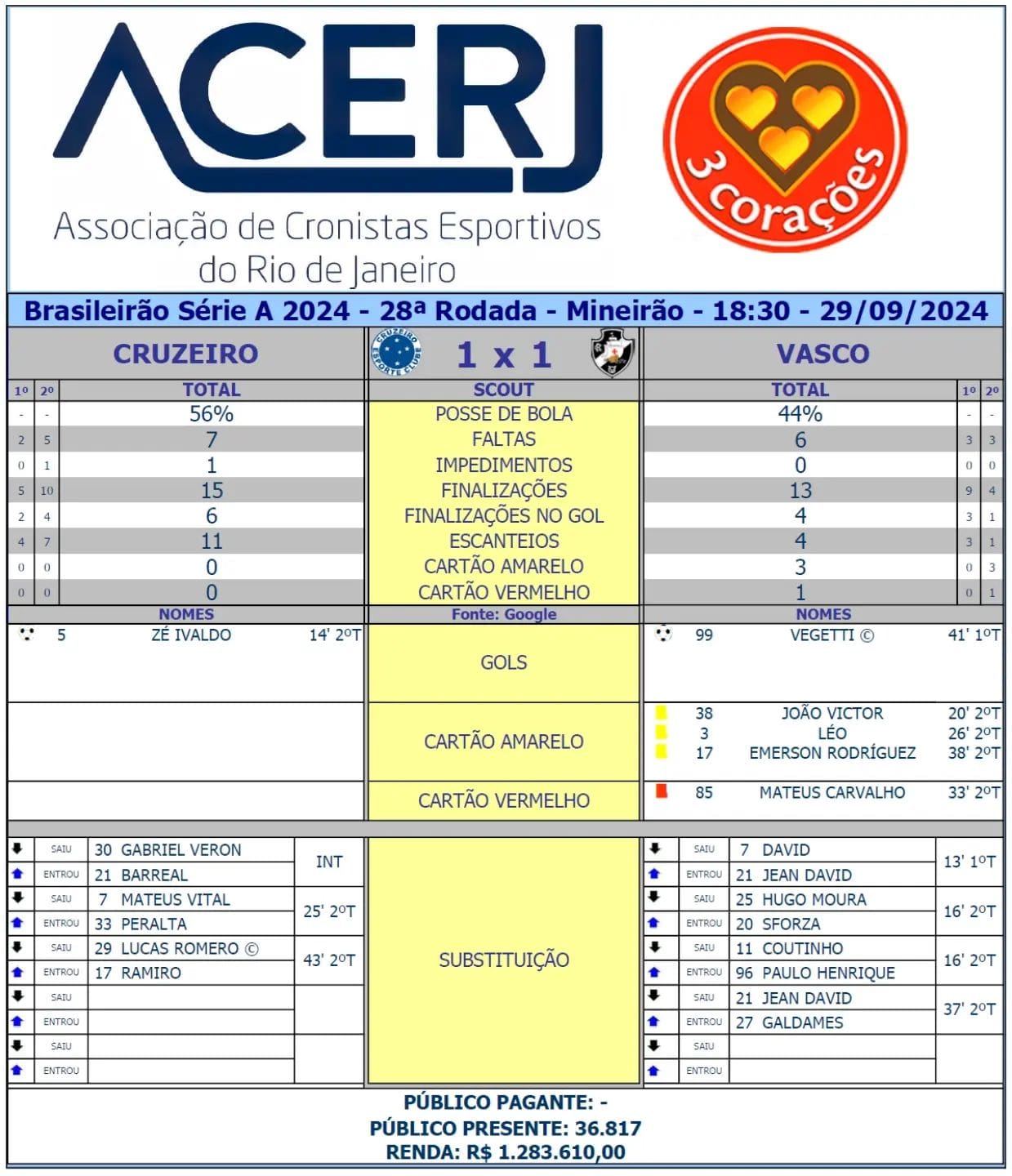 Confira as estatísticas da partida Cruzeiro 1 x 1 Vasco domingo, 29/09/2024 às 20:35 — Em Últimas notícias