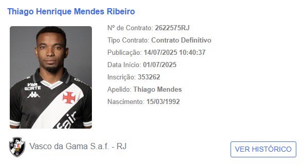 VASCO OFICIALIZA A CHEGADA DO VOLANTE THIAGO MENDES segunda-feira, 14/07/2025 às 10:24 — Em Destaques