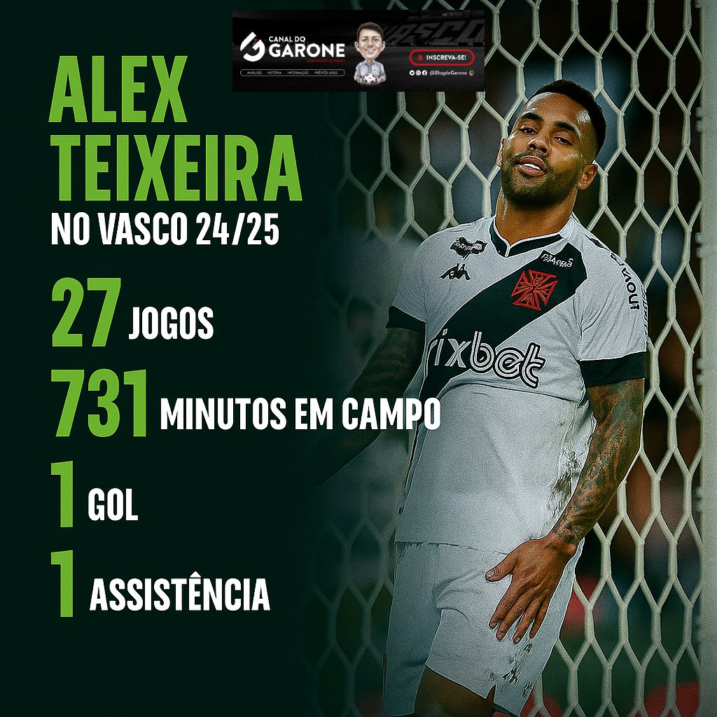 Alex Teixeira registra 1 gol e 1 assistência em 27 partidas desde seu segundo retorno ao Vasco. domingo, 13/07/2025 às 13:55 — Em Últimas notícias