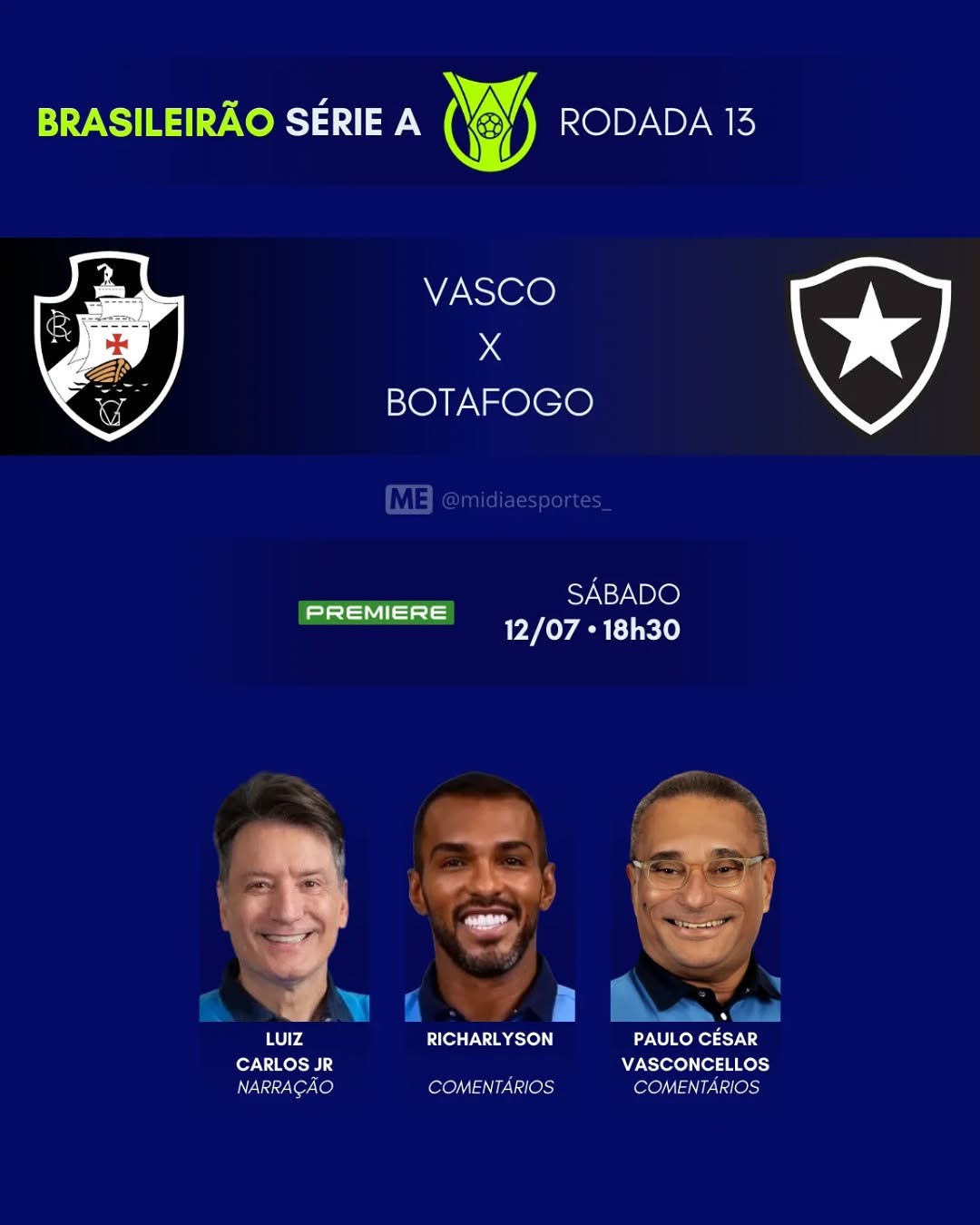 Conheça os especialistas que estarão responsáveis pela transmissão de Vasco x Botafogo na televisão. sábado, 12/07/2025 às 08:22 — Em Últimas notícias