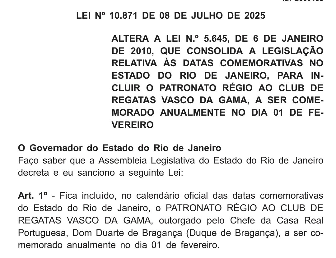 Dia do Patronato Régio no Club de Regatas Vasco da Gama, 1º de fevereiro, é oficializado como data comemorativa no calendário do RJ. quinta-feira, 10/07/2025 às 04:33 — Em Últimas notícias