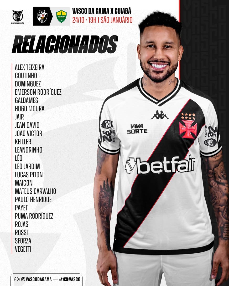 Vasco anuncia os jogadores convocados para a partida contra o Cuiabá; Jair é a principal novidade. quinta-feira, 24/10/2024 às 16:07 — Em Últimas notícias