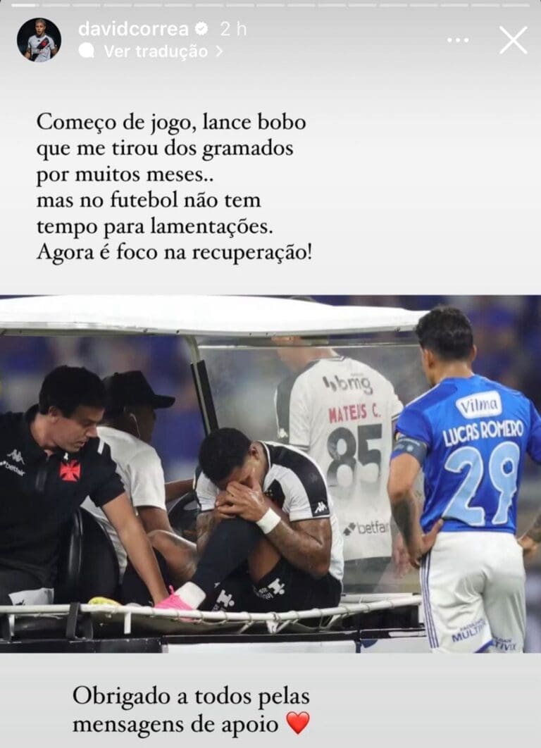 David expressa sua tristeza pela lesão e agradece pelas mensagens de carinho recebidas. segunda-feira, 30/09/2024 às 16:12 — Em Últimas notícias